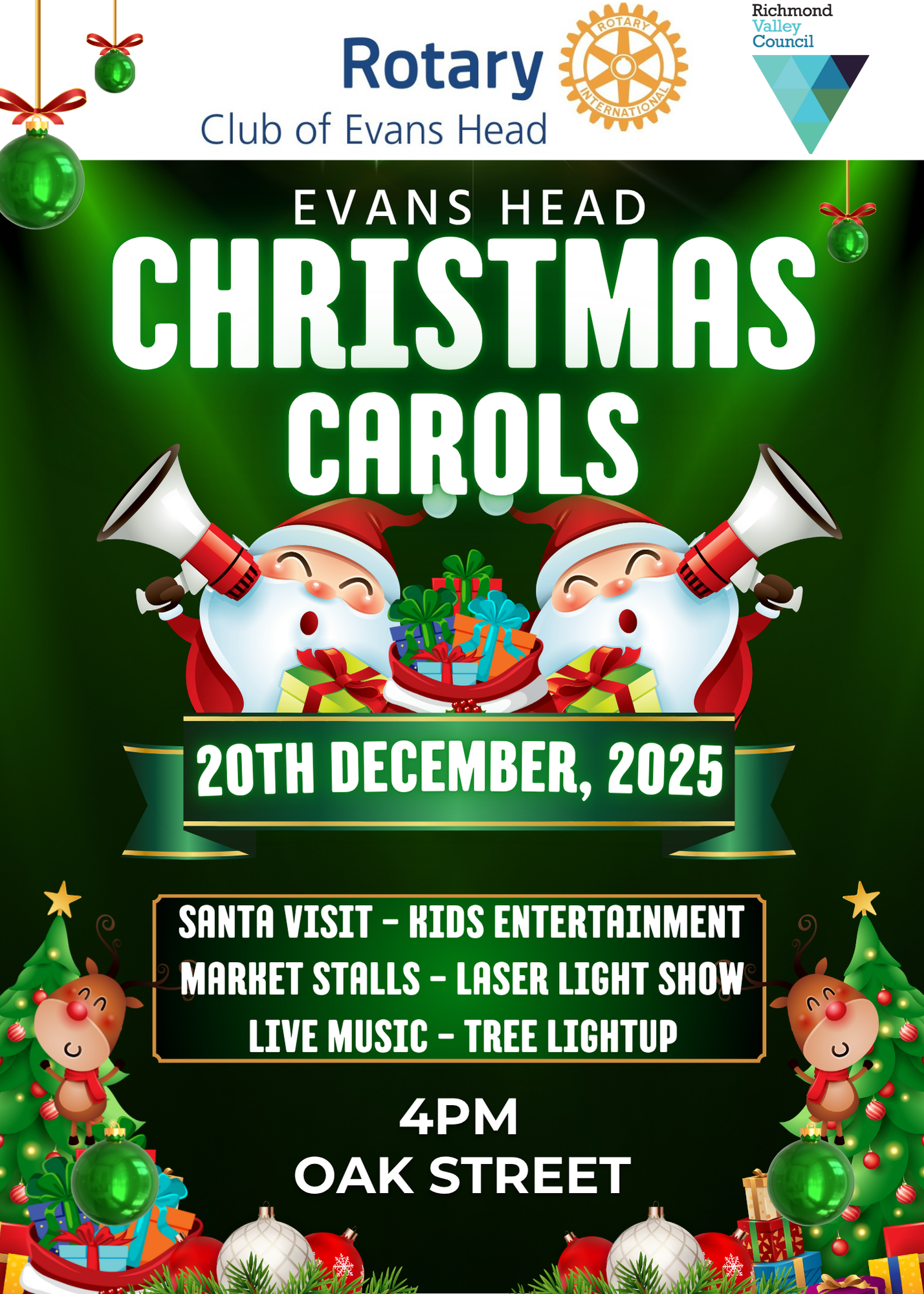 Join the Rotary Club of Evans Head for the 2025 Christmas Carols! Head to Oak Street on 20 December from 4pm for all the action including: kids entertainment, market stalls, laser light show, lie music, tree light up and a visit from Santa!