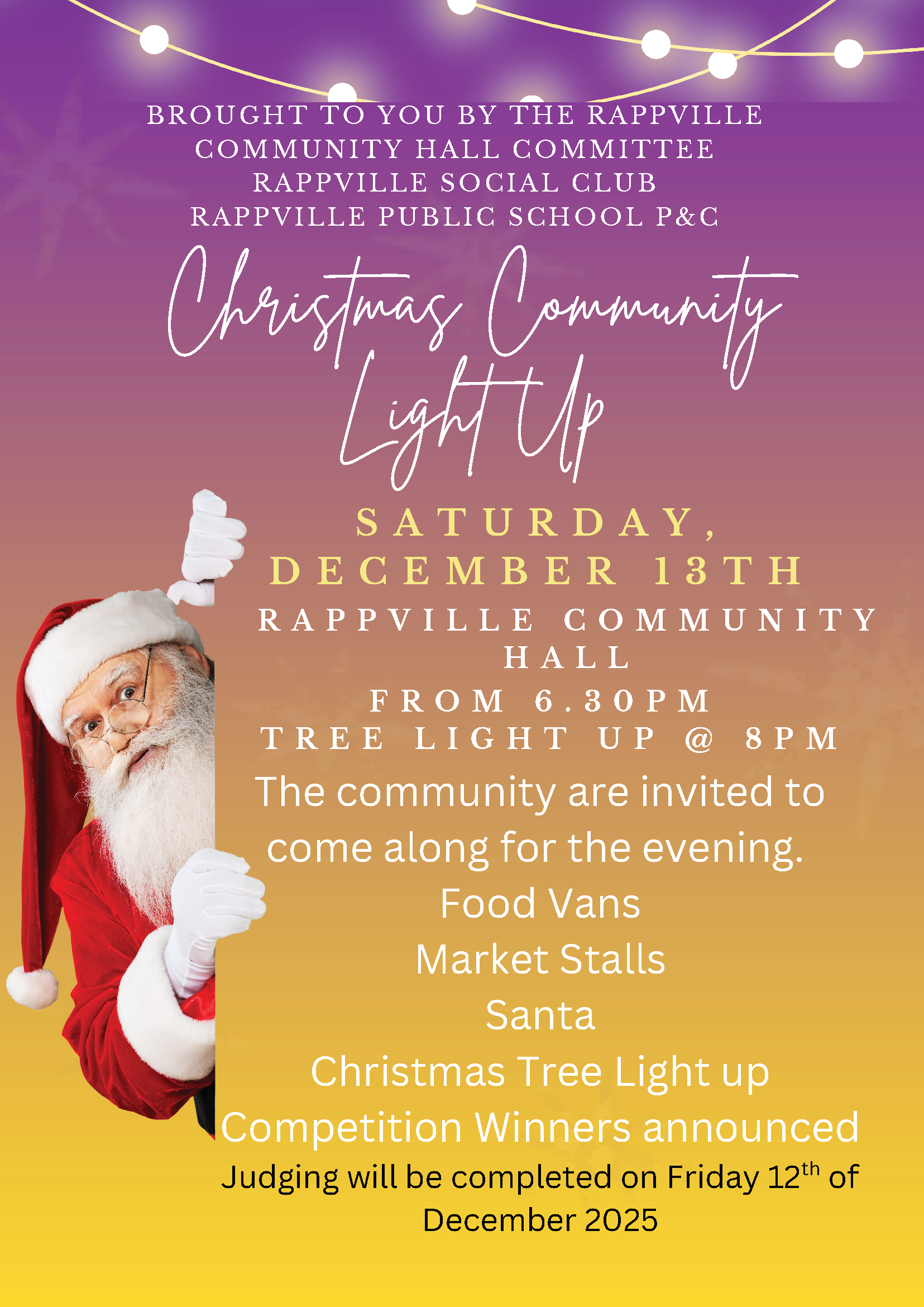 Join the festive fun at Rappville Community Hall on Saturday 13 December from 6.30pm for the Christmas Community Light Up! Enjoy food vans, market stalls, a visit from Santa, and top the night off with the Christmas tree light up.