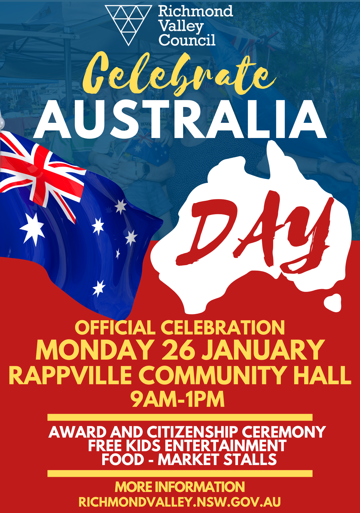 Join us at Rappville Community Hall for the 2026 Australia Day Celebrations. There'll be kids entertainment, food and market stalls, plus the award and citizenship ceremony. 9am-1pm.